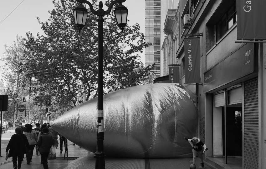 یک بدنه بادی و نرم- یک بادکنک نقره ای- به سمت پیاده رو در قلب سانتیاگو پراکنده می شود. مردم با لمس این مصنوع عجیب راه می روند و با کنجکاوی به شی در حال حرکت در فضای عمومی نگاه می کنند و در پشت این بالشت بزرگ، گالری گابریلا میسترال ناپدید می شود.
